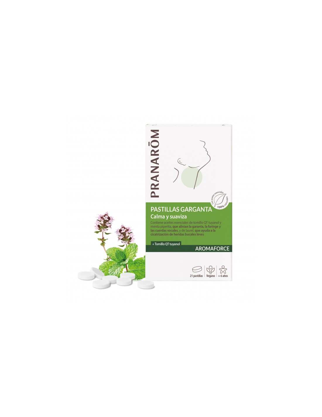 Calma y suaviza - Contiene aceites esenciales de tomillo QT tuyanol y menta piperita, que alivian la garanta, la faringe y las cuerdas vocales, y de laurel, que ayuda a la cicatrización de heridas bucales leves