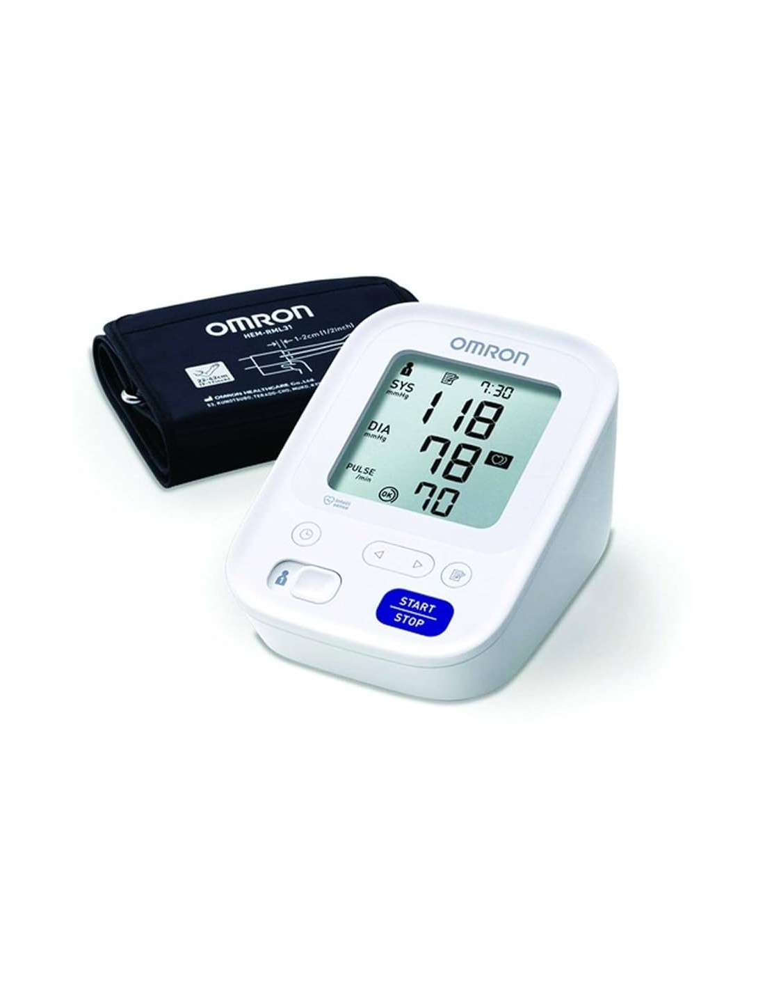 Contenido: 1 monitor de presión arterial de brazo OMRON M3, manguito Easy (22-32 cm), 4 pilas AA y manual de instrucciones