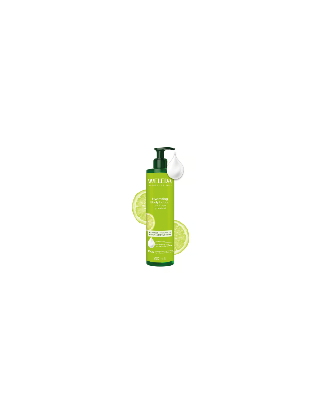 Leche Hidratante Corporal formulada con aloe vera biológico, extracto natural de limón y ácido hialurónico.